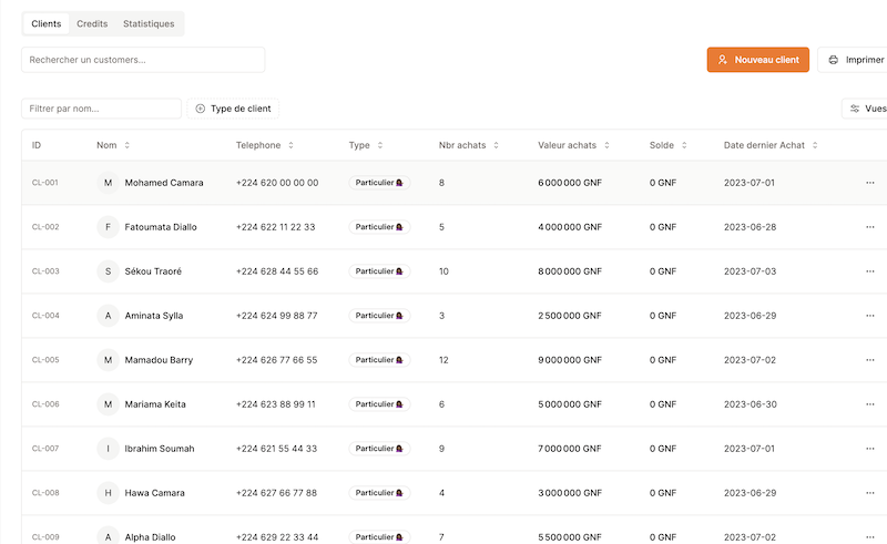 Historique des achats, crédits clients, performances employé.